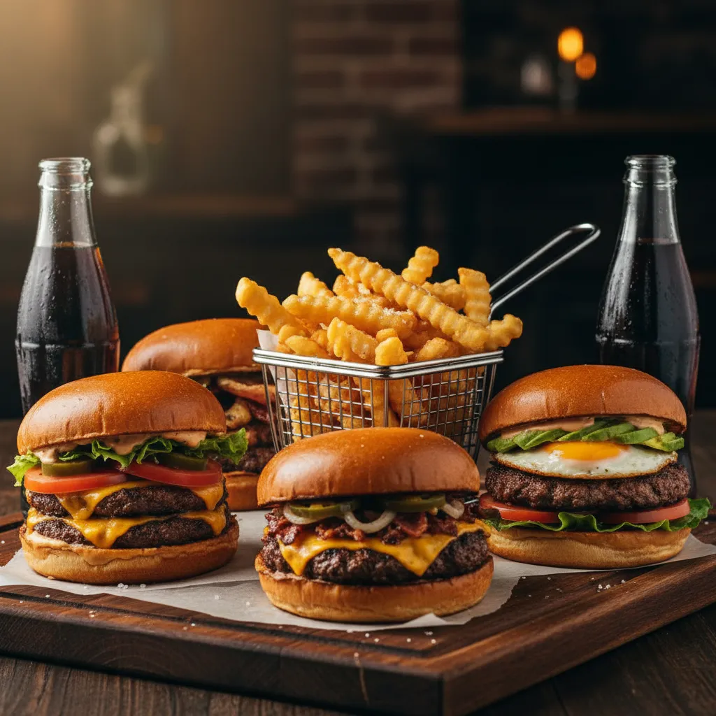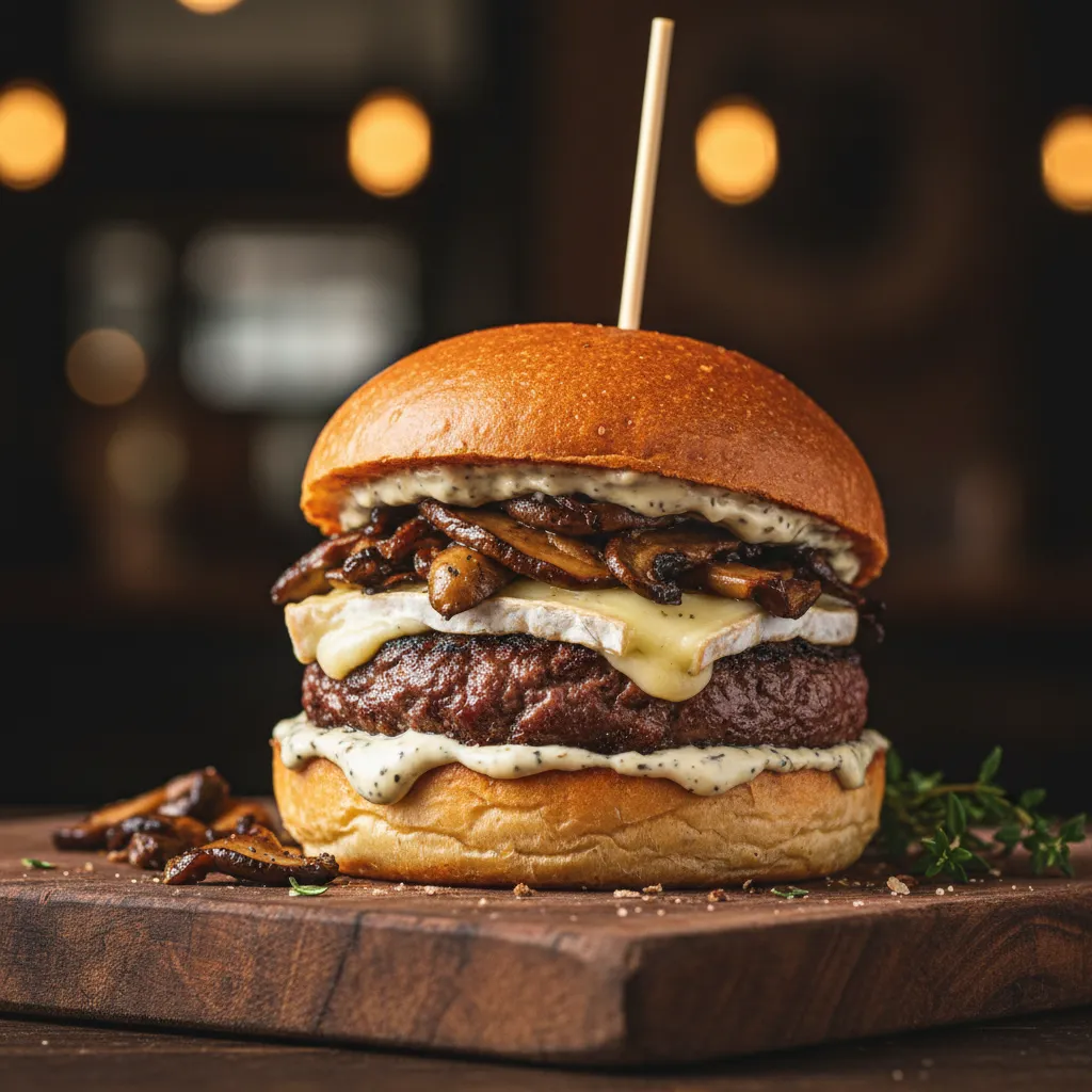 Blend bovino angus 180g · Pão australiano, queijo brie, cogumelos, maionese trufada