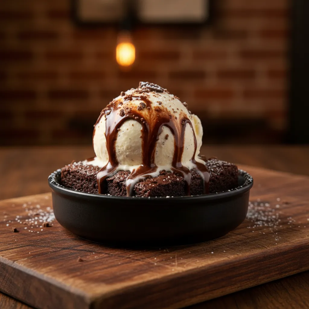 Brownie de chocolate belga · Servido quente com bola de sorvete de creme e calda de chocolate
